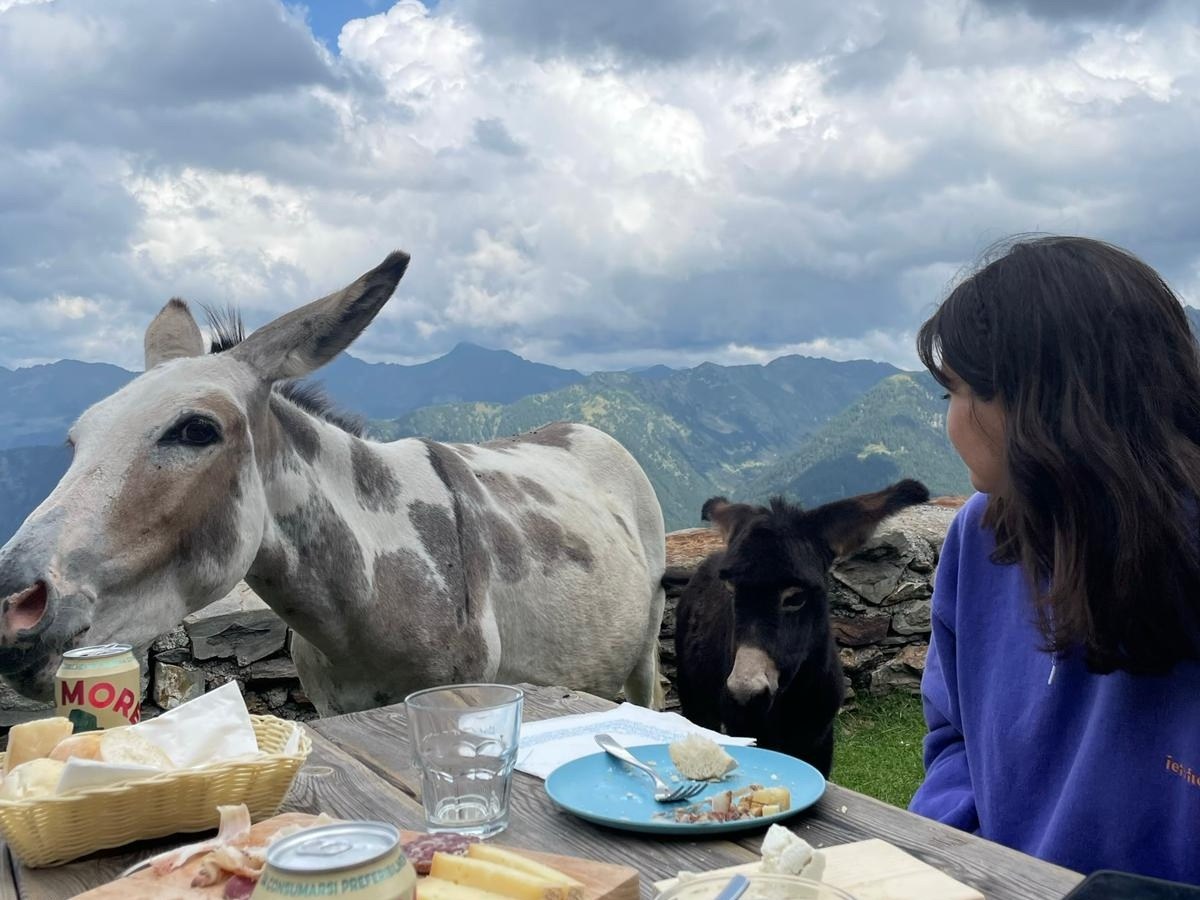 - lunch at Rifugio Alpe Stavello with a menu consisting of a platter of locally produced cold cuts and cheeses, main course with polenta taragna and mix of veal stew and braised donkey, a glass of wine, house dessert, coffee and bitter;
